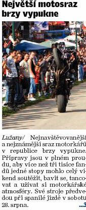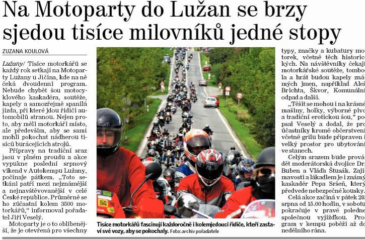 Vloženo: 18-08-2009Dne 14.08. 2009 vyšel velký článek o MOTOPARTY 2009 v Jičínském deníku..