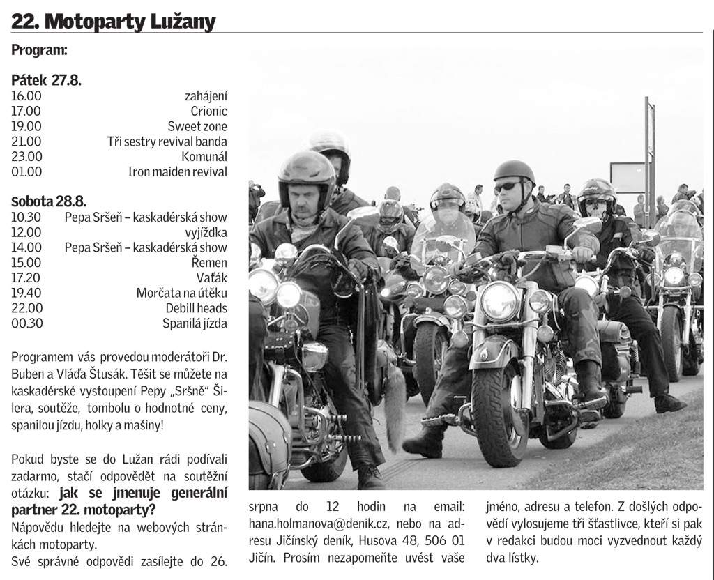 Vloženo: 19-08-2010Pozvánku na MOTOPARTY Lužany u Jičína 2010 hledejte v Jičínském deníku..